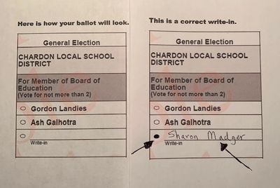 I need your support. Vote for Sharon Madger on November 4, 2025. Remember to be sure to color in the oval and print my name on the ballot as shown. You may ask the poll worker for a list of the write-in candidates on election day. Let's make our school community proud.